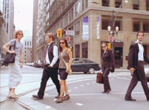 Increadable film installation by Toronto based artist Paulette Phillips Crosstalk. As if we stand still and the world spins around us. Phillips films crosswalks of a busy intersection, speed of life and technology wizz around us.