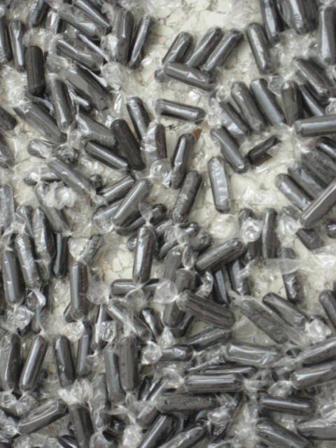 Felix Gonzalez-Torres used 700 lbs of individually wrapped licorice in an analogy to missiles and oil, pariotism and capitolism . His use of these dark multiples, manufactured goods, and strings of lightbulbs, playing with the idea of candy is a sinister melange of sweets and darkness.