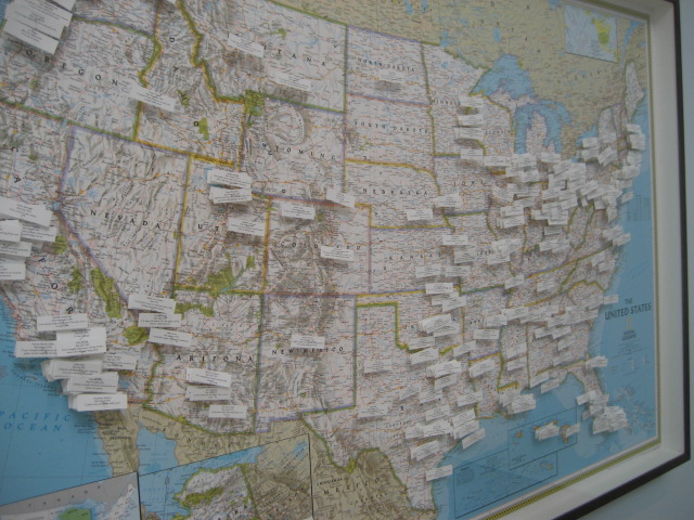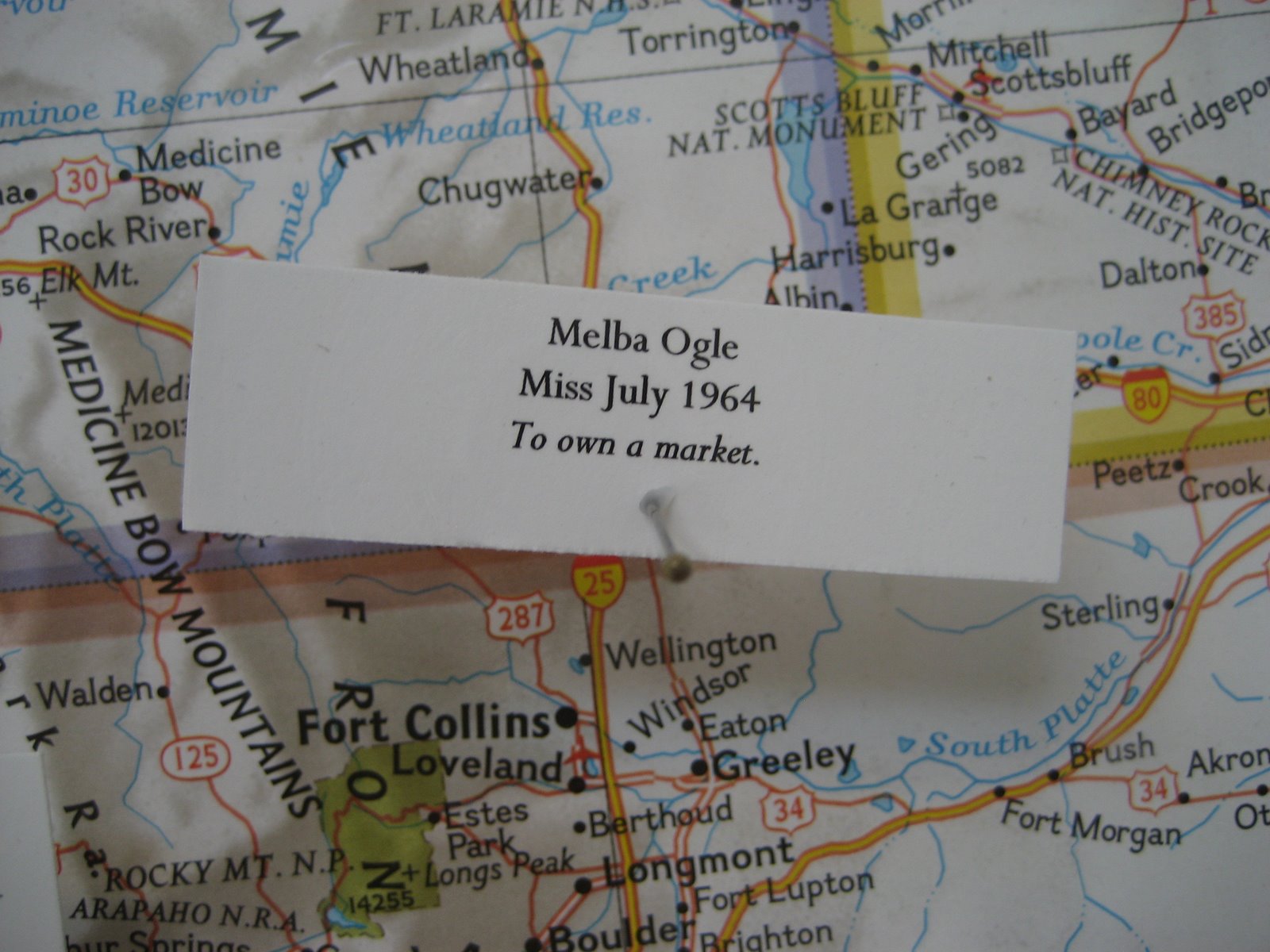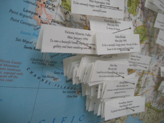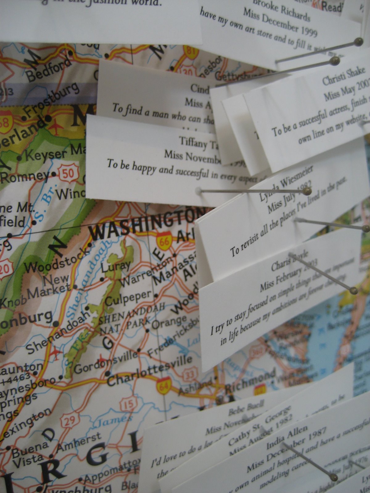 At London’s Haunch of Venison Gallery, a witty humorous exhibition by Jamie Shovlin. Using a wall sized map of the USA Shovlin runs a hilarious and insightful commentary on the Miss America Pagent and the famous question ” What would you do if you won Miss America?” Flagged by fortune cookie wisdom sized tags, tacked to the map with a single pin, it was hard to overlook the abundance of winners from California