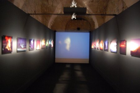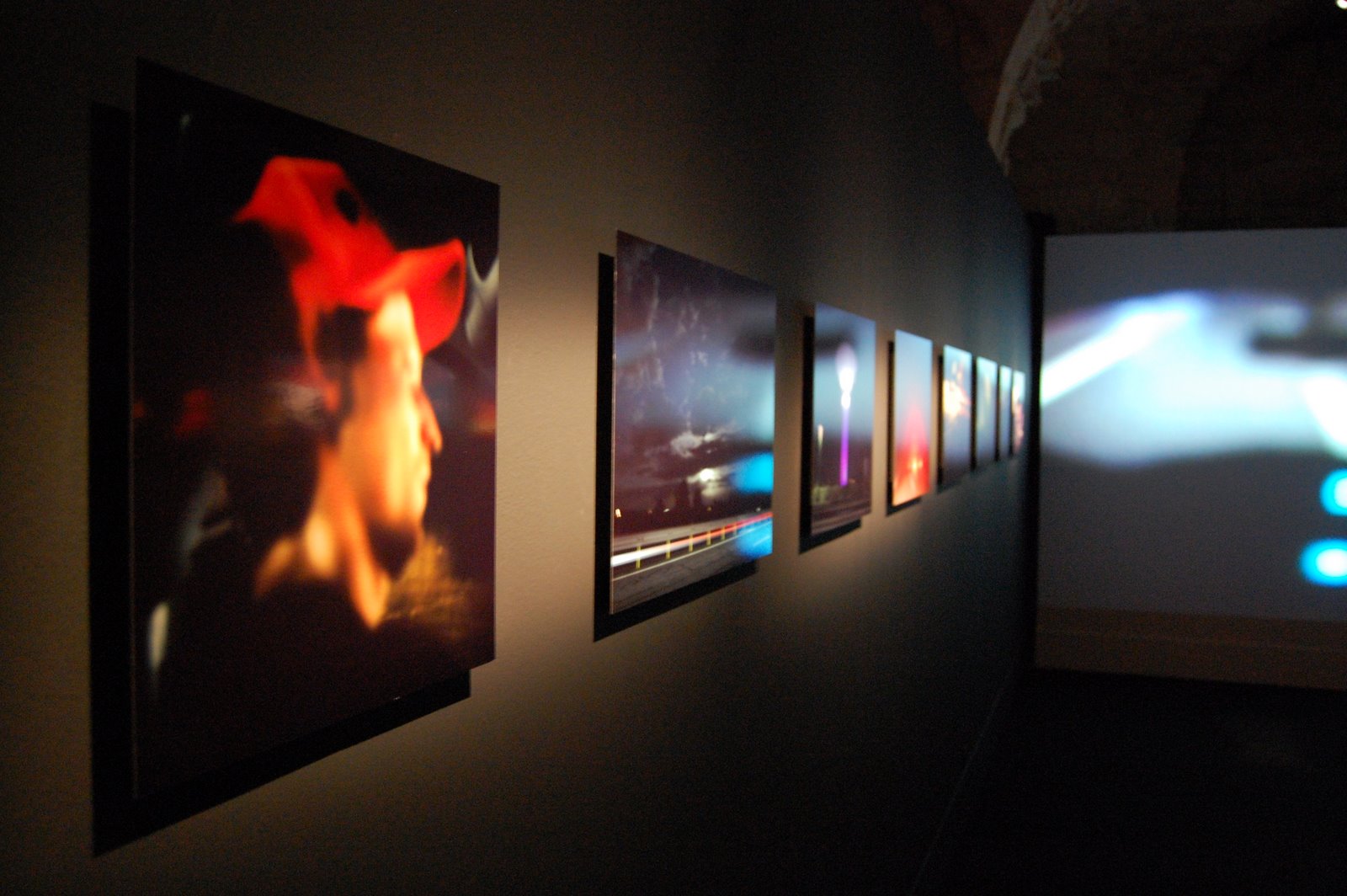 A narrow room, sides lined with photos radiating a luminous red-orange glow, crowned by a video of the streaming night highway.