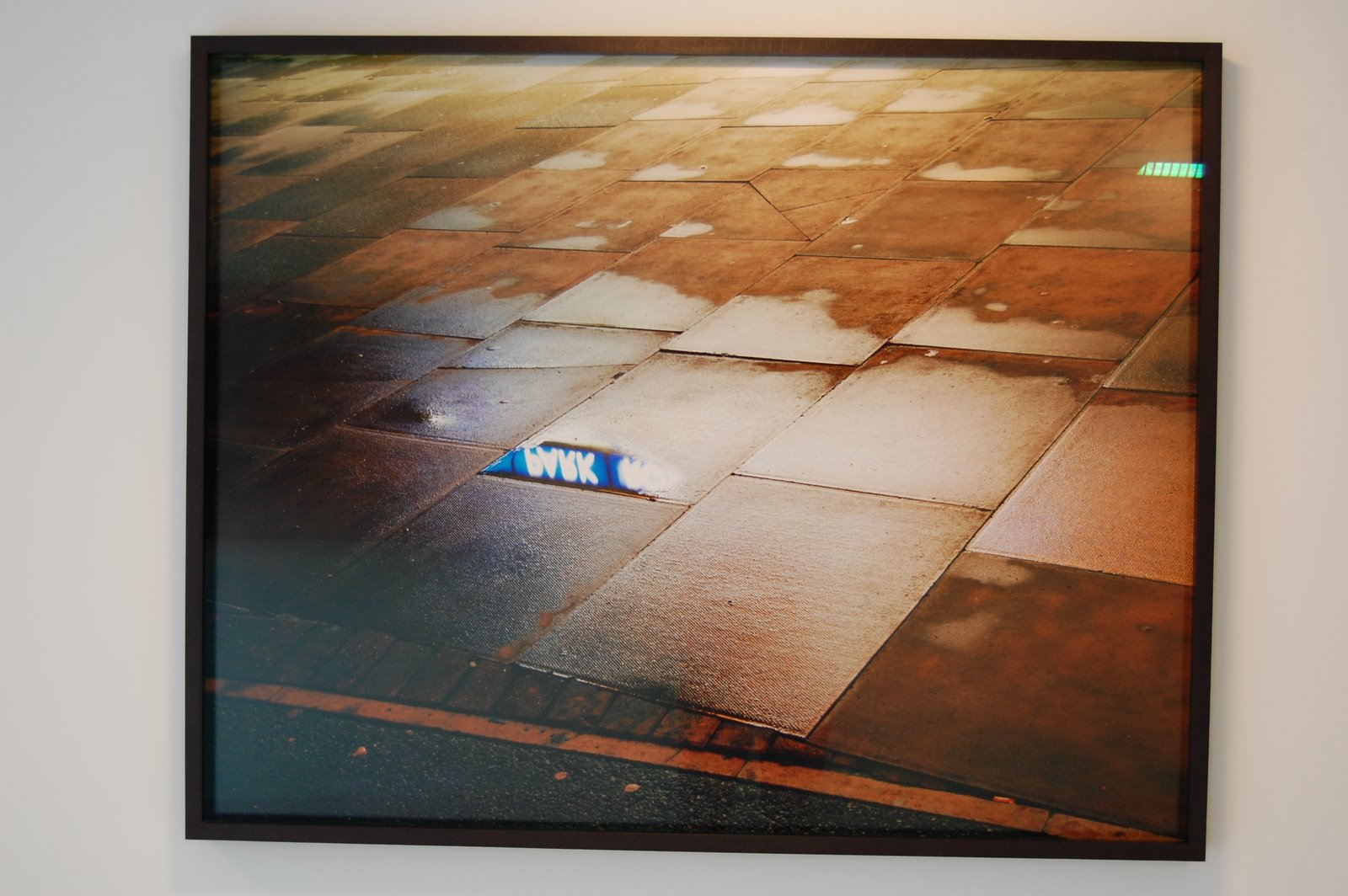 At Dominique Fiat Gallery in Paris on a mild automn afternoon we meet London’s underground and the rain. Rut Blees Luxemburg follows along the Picadilley line photogaphing reflections of the tube station signs mirrored in puddles on wet sidewalks.