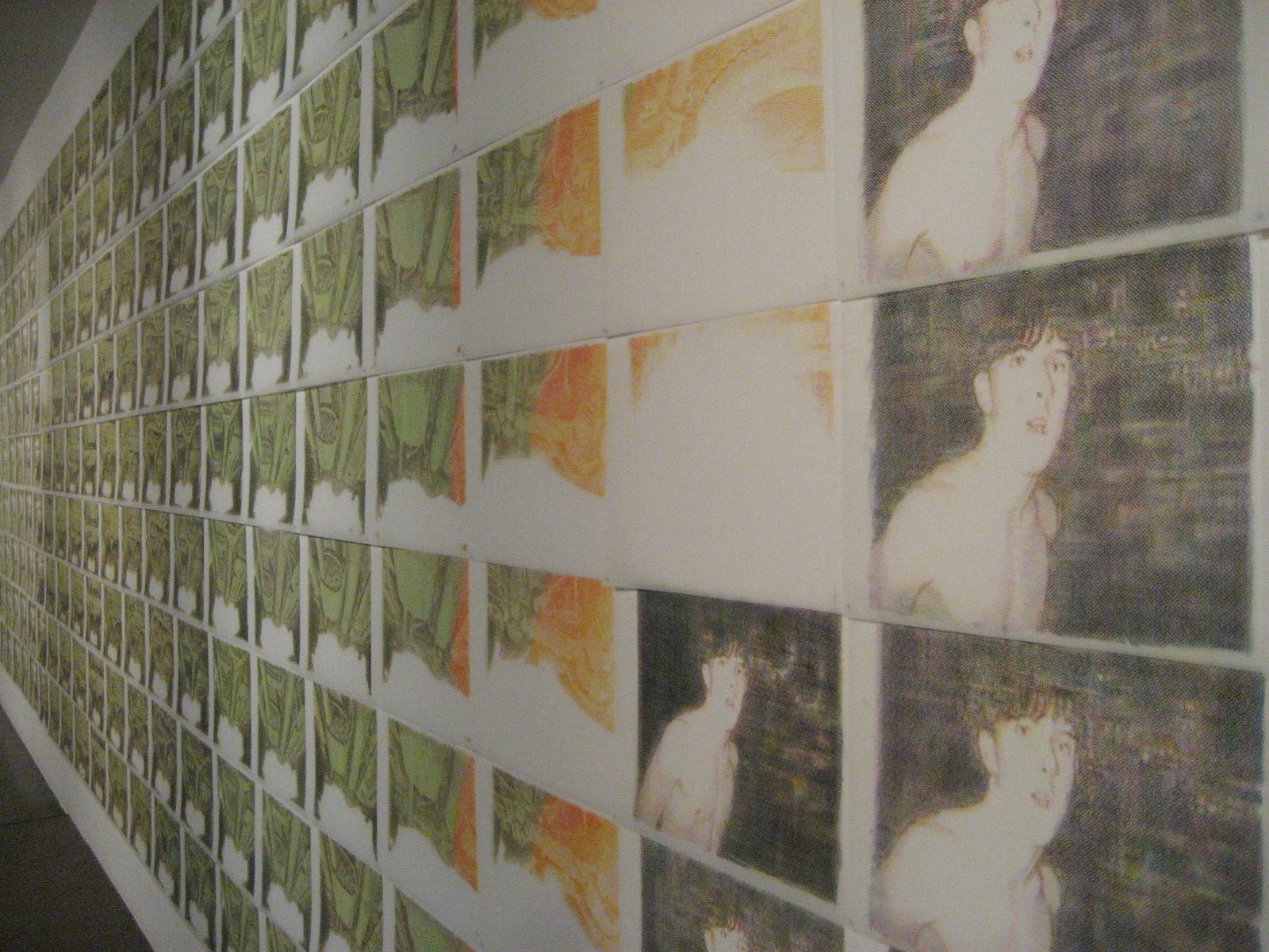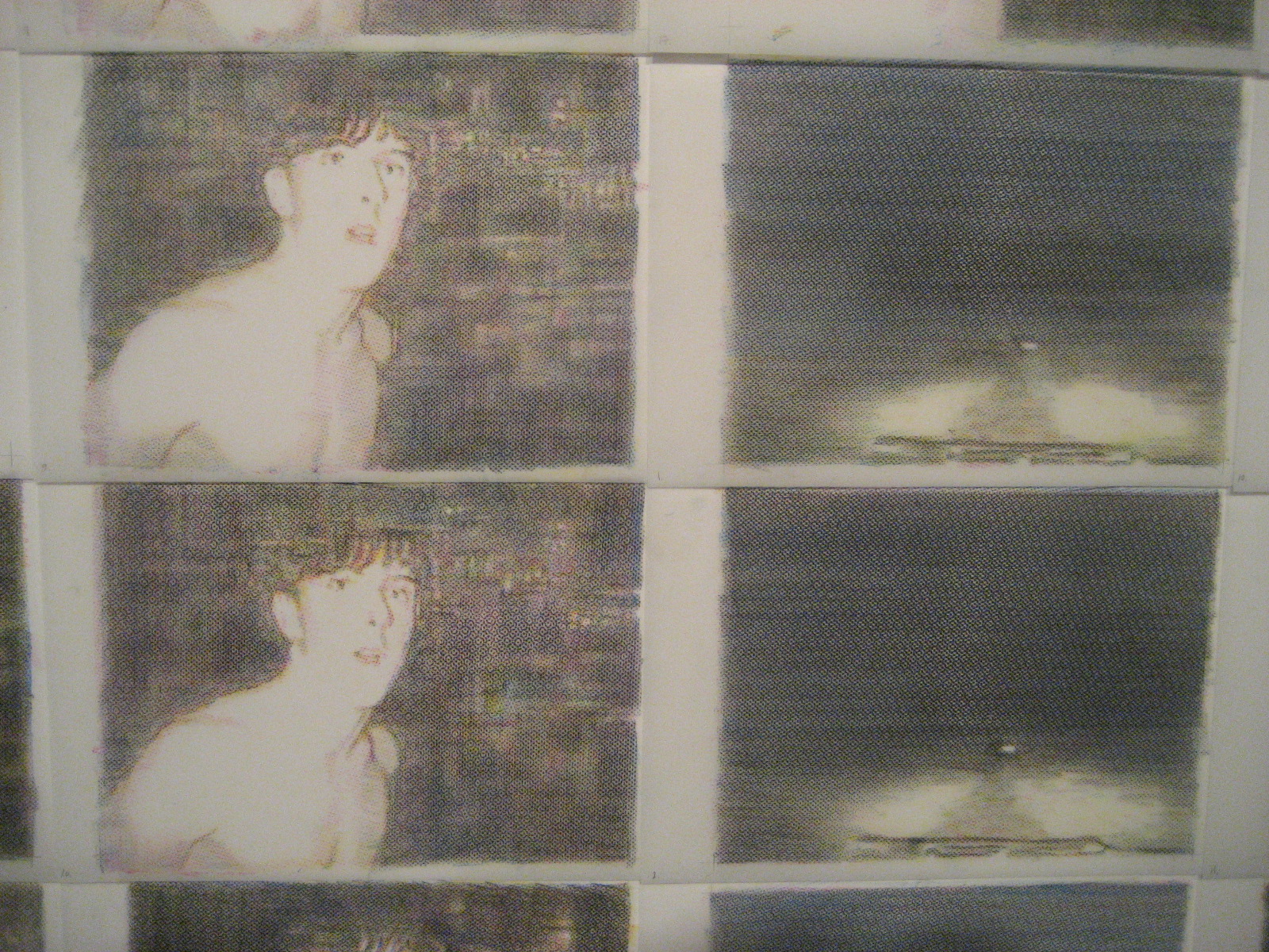 Stephan Andrews exhibit lined one wall in its entire longer with hand drawn film stills the other projected a short animated film. Using crayon drawings on mylar he creates stills relating to media and internet.