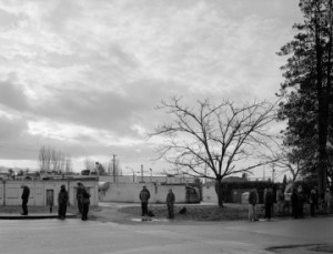 These black and white works by Jeff Wall at the Guggenheim, the solitude of seemingly Vancouver suburbs of Wall’s youth. Subltly reflective, remaining voyeur of a scenario of which the narrative is not so ledgable. Young boy sitting in a field around an overturned shopping cart, men waiting on a street corner where the landscape of the photo dwarfs their bodies.