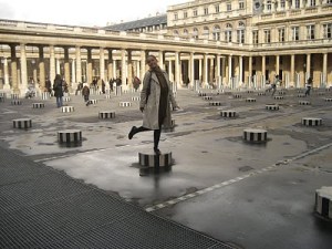 Daniel Buren ‘s black and white marble columns were installed in the Cours de Palais Royale in 1986. C’est beau. A dominant theme in his works, a dialogue between the art in the museum confines and out, a modernized mirror of the columns and arcades which surround the works. In 1986 when the work was comissioned for the space, as typical French tradition, it created a scandal, modern art’s place within the cours behind the Comedie Francaise.