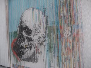 Using Pop Art Warhol-esque symbols and icons, other times superimposing video projections, the layers of chains which create a massive swaying tableau.