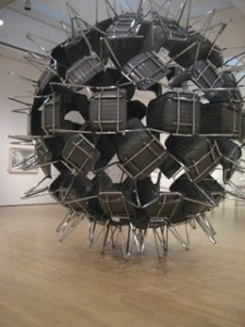Michel de Broin who creates in toying with paradox by inviting competing references to take up residence in a materially manifest form. In this approach conceptual moorings are severed by aesthetically confronting the viewer with an assemblage that silences or troubles the ideas it purports to speak for. In his sculpture “Black Whole Conference” the artist uses ordinary chairs—the primus locus of collective discussion —as building blocks to construct a sphere that inscribes itself on several intertwined conceptual levels: that of a public sphere with its open, non-hierarchical and egalitarian communicational architecture, that of an immunological system that is closed upon itself to ensure internal cohesion by defending against external threats, and that of a voyage ready astronautic capsule.