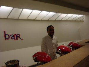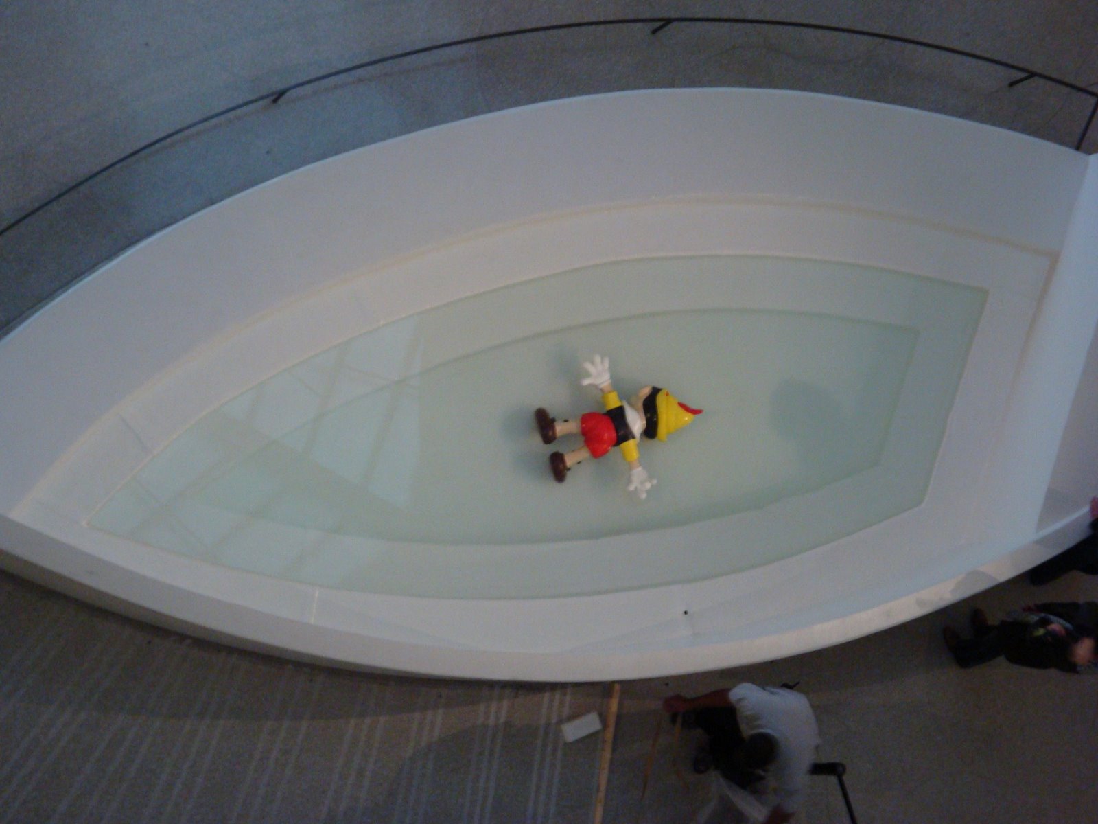 Maurizio Cattelan Pinocchio floating facedown in the fountain…. yet the visitors seemed more complexed by the the mysterious “free coffee stand” not realizing that in fact it is an installation work by Rirkrit Tiravanija.