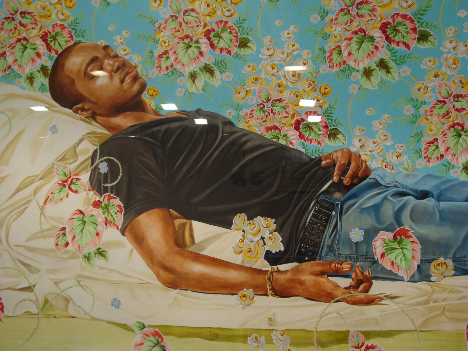 He describes his approach as “interrogating the notion of the master painter, at once critical and complicit.” He makes figurative paintings that “quote historical sources and position young black men within that field of ‘power.’” His “slightly heroic” figures, slightly larger than life size, are depicted in poses of power and spiritual awakening.