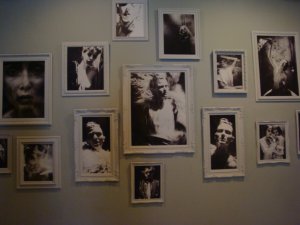 30 black and white photos are hung salon style, with ornamented frames painted the same egg shell colour as the walls. The images are of beautiful young models in a dark dirty vaudeville-esque narrative. They are active, pensive, often smoking cigarettes.