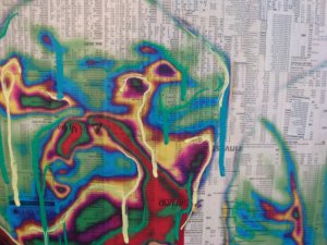 Jack Shainman Gallery presents large paintings by London-based Gordon Cheung. These techno-coloured landscapes are stocklistings, acrylic gel and spray paint on sail cloth. Resulting in an amazing layered quality and depth.