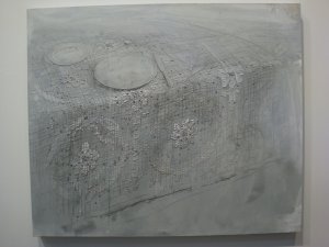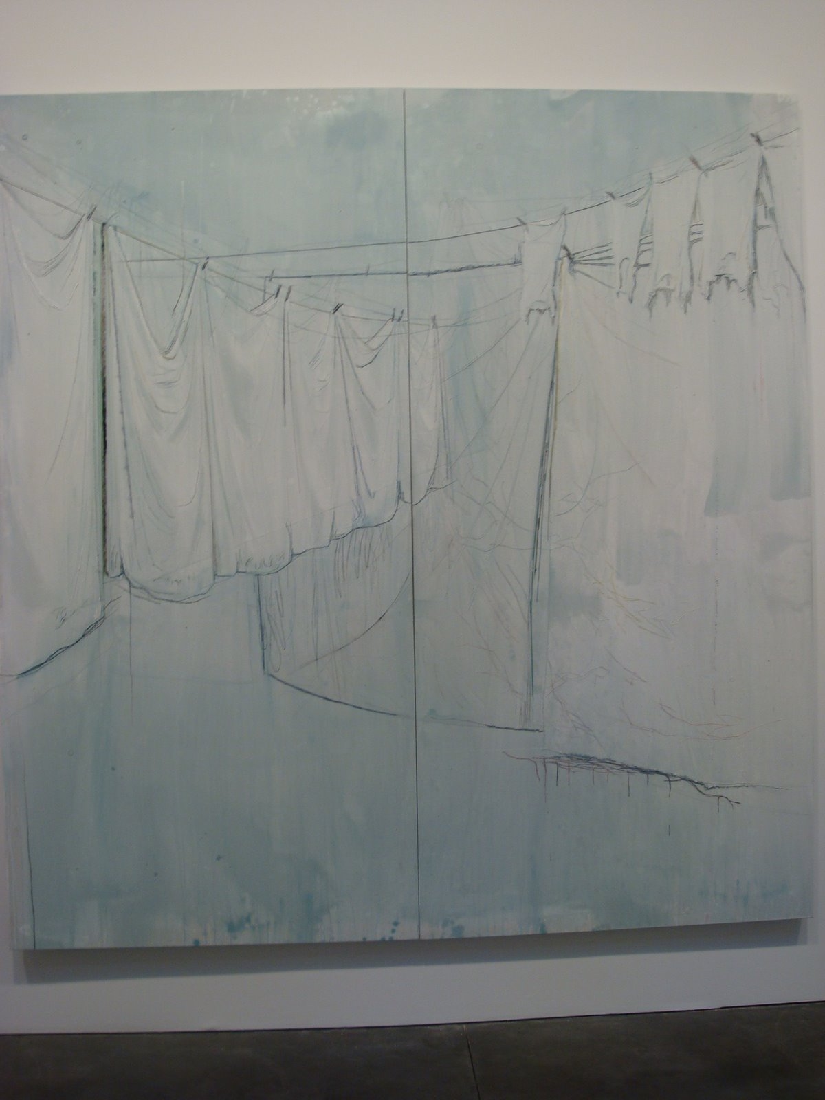 Michael Raedecker exhibition is titled Fix, on view at Andrea Rosen Gallery. These large paintings are accented with stitching and embroidery which give a nostalgic quality to an already airy imagery.