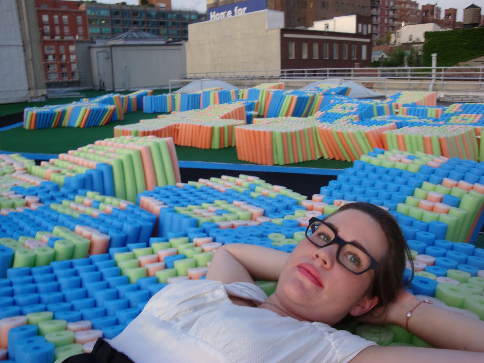 Pool Noodle Rooftop is a vibrant outdoor installation by Jeffrey Inaba’s studio INABA. Specially designed in X shapes, outdoor furniture was constructed from pool noodles that have been cut and bunched into chaise lounge chairs that spell out the word “bububluooopppp”