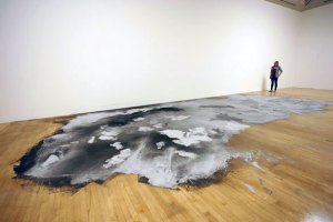 Richard Hiorns has covered half of a gallery floor with the black and grey metal dust of an atomised passenger aircraft engine, in a work designed to question our faith in technology and remind us of our own mortality.