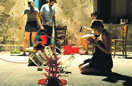 An elegy to Snowwhite, the rubies are an element to inspire lust and lustfulness in the 165 proof vodka that is the bi-product of the beautiful heating and cooling distillation process. Traced on the floor were ghostly white chalk drawings of all the elements and objects used in the distillation process.