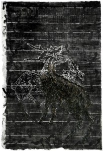 Encircling Rulai are 3.5meter tall ink drawings made on handmade paper, featuring fleeing animals in dark dramatic pursuit. Huan’s use of feathers gives an lightness to the solemn imagery.