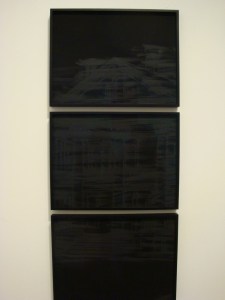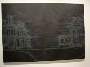 Gary Simmons uses a distinctive technique to create his large scale paintings. He creates the slate board haunting chalklines with a combination of pigments, oils and wax.
