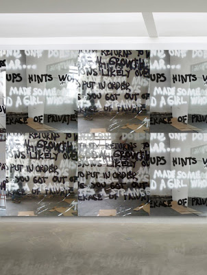 Current show running in tandem with Joan Jonas Reading Dante III, is Stefan Bruggemann installation which covers the walls with mirrored panels. On the mirrors the artist has painted final dialogue of dramatic films. The text is brief, sharp, poignant and affectionate.