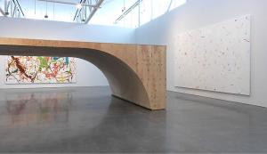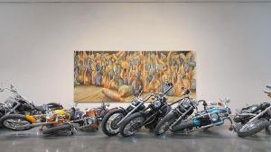 Colen creates a transitionary space using an inverted skateboard half-pipe, and installation of knocked over customized Harley Davidson motorcycles, and massive canvases with abstract patterns painted with chewing gum. A self-reflective self-indulgent show.