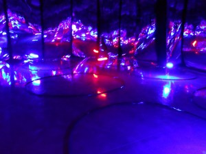 Lithuanian installation artist Zilvinas Kempinas uses magnetic tape film, fans, reflective panes of mylar to create this cool and visually striking space. Red and Blue coloured lightbulbs hanging by their wires circle and spin around in localized confinement while noisey fans push the bulbs and the loops of magnetic tape. The experience is an overwhelming sensation of chaotic and static at the same time.