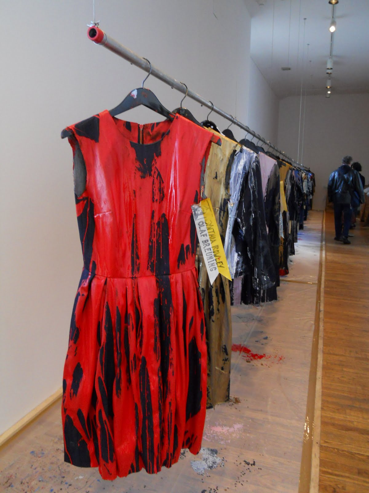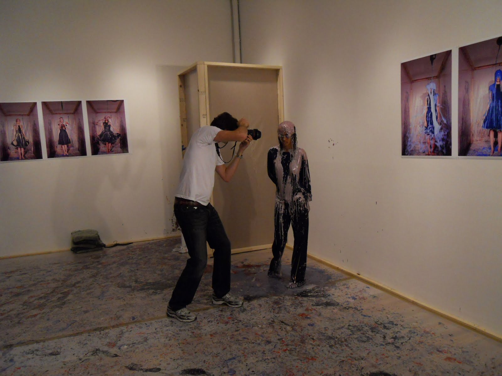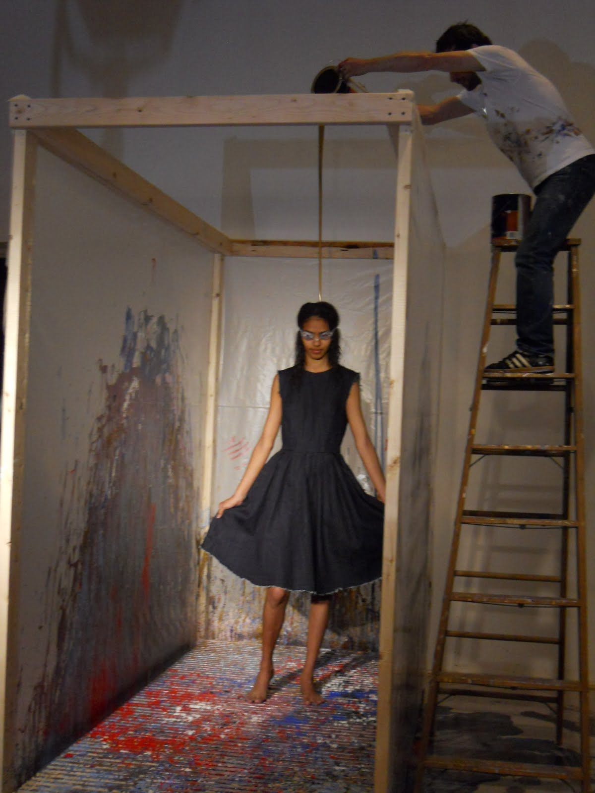 Spectacular Olaf Breuning and Cynthia Rowley. Rowley created bespoke denim outfits, and the models had paint poured on them by Breuning. A photographer captured the performative aspect of the pouring and the presentation of the new work of art, while the garment became the unique art object.