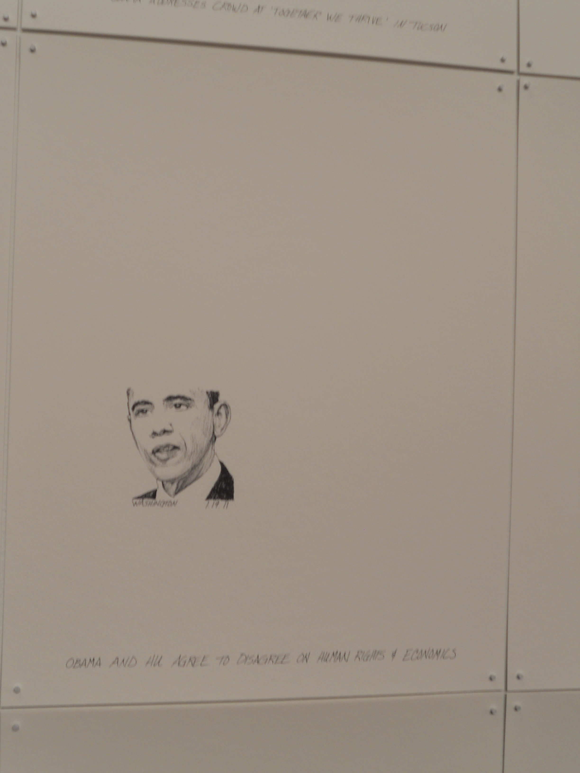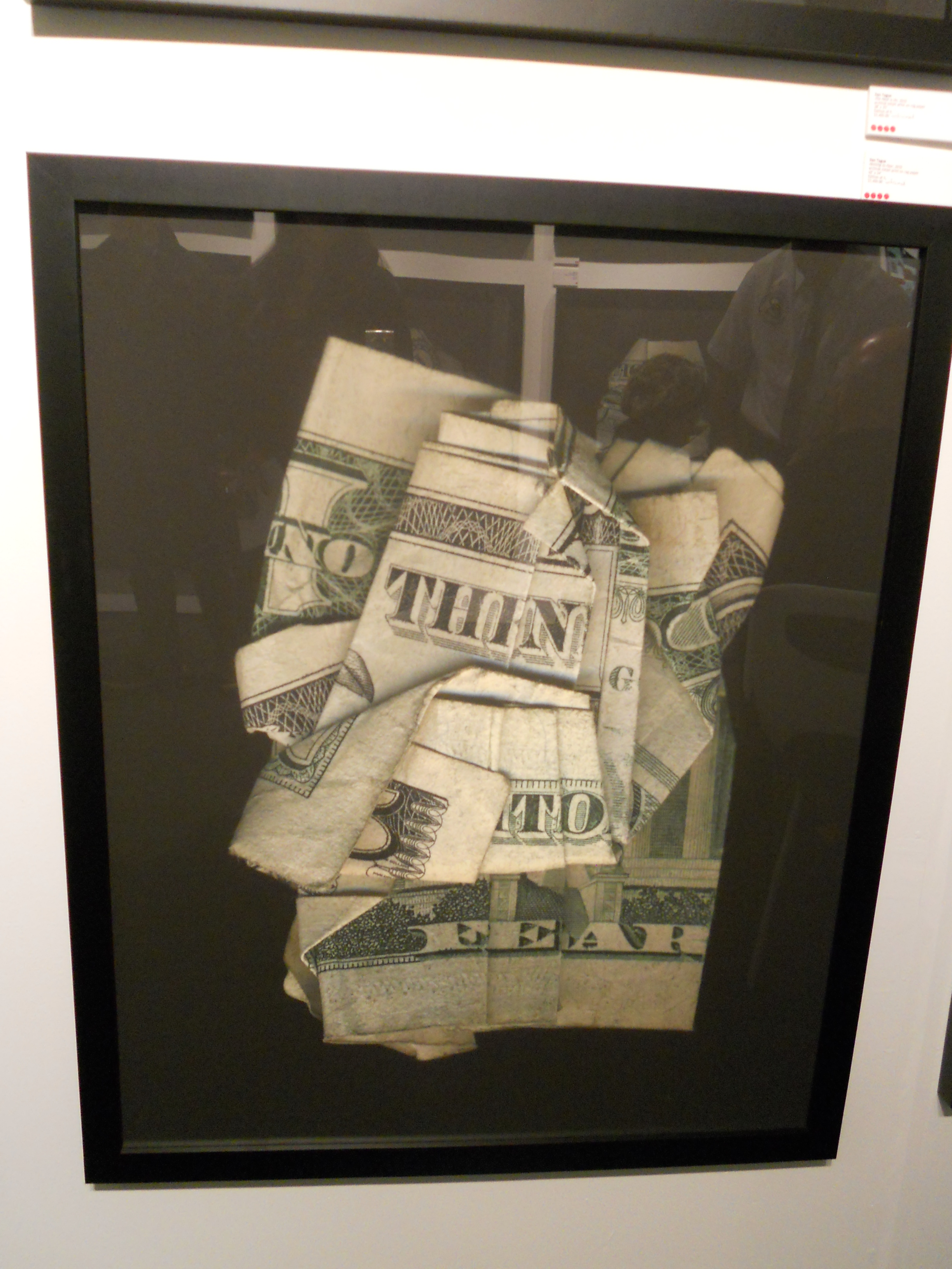 To be expected, beautiful but politically charged art was rampant, like Alberto Borea’s photos about drug wars at Isabel Hurley, Mark Jenkins’ terrifying installation of a masked thugs, Dan Tague’s photos of folded dollar bills which spell out messages for help at Jonathan Ferrara, and Mary Temple’s ink drawings on paper of portraits of political figures.