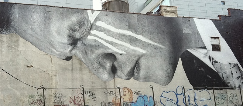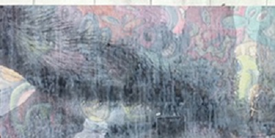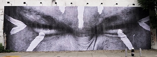 French street artist JR has been selected to replace KennySharf’s vividly illustrated grafitti wall with a somber massive black and white wheatpaste. In an ironic contrast – caused by post huricane Irene water damage, JR’s paper began to weaken showing Sharf’s mural through the background.