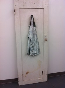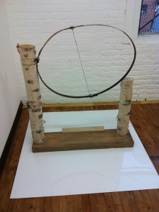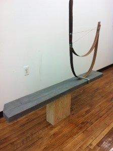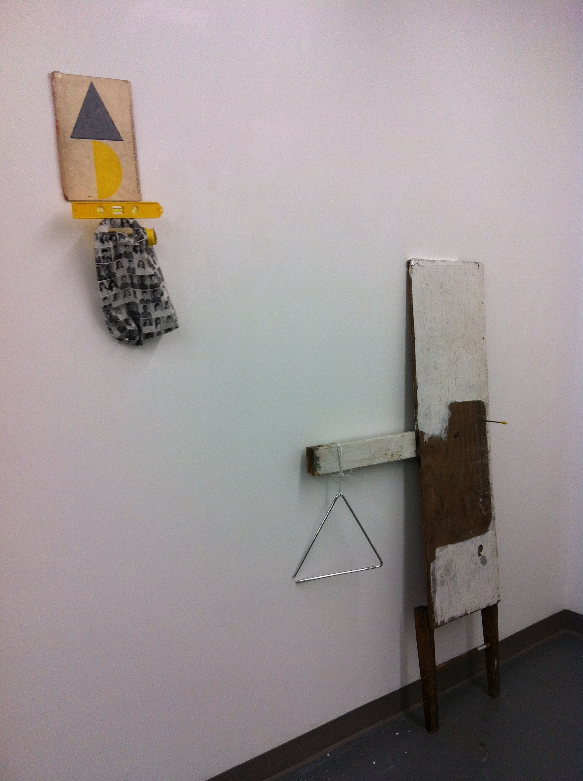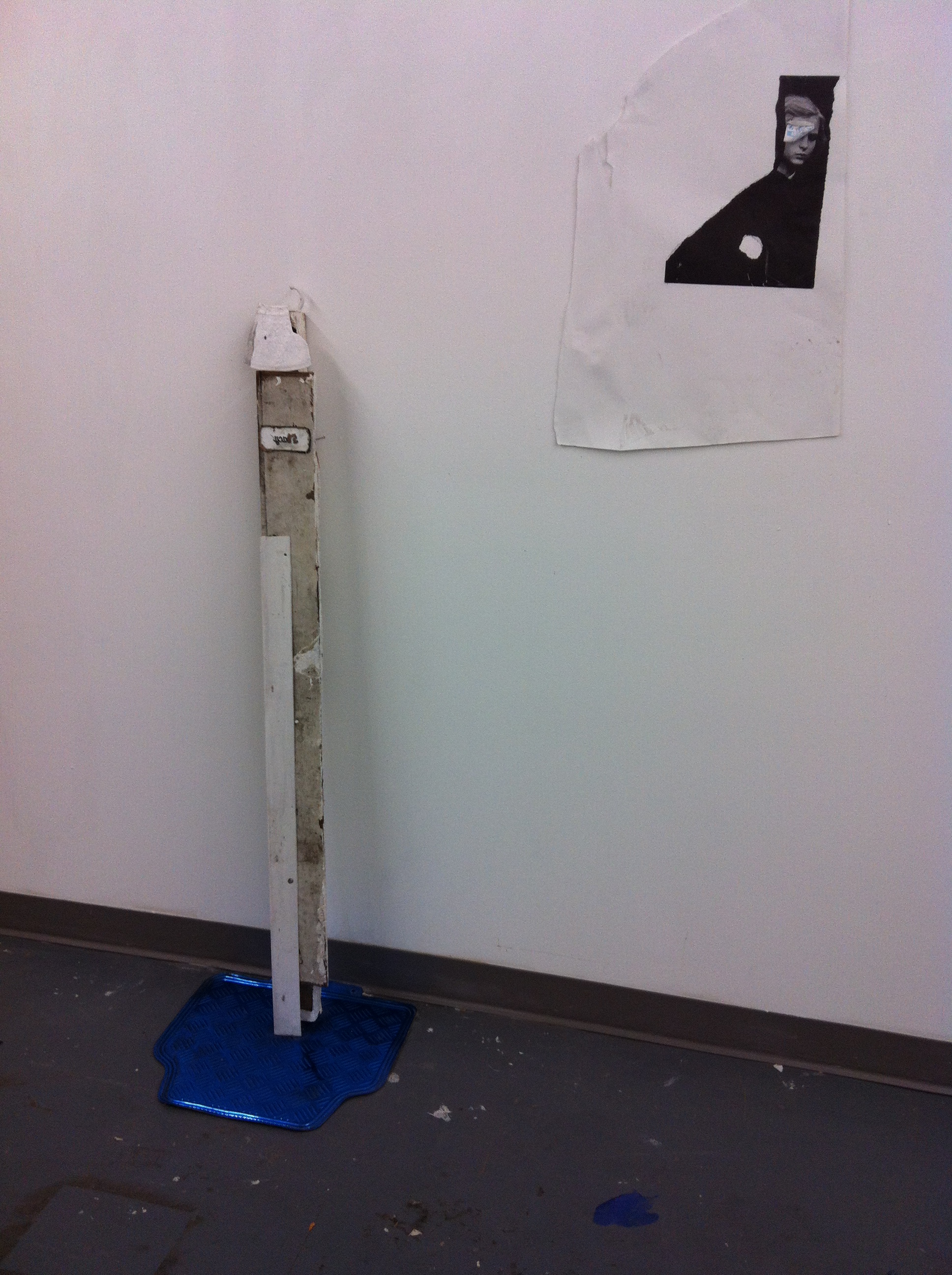By far the best work I saw during the Bushwick Open Studios was by Ross Tibbles. His work of mixed media and found objects, insist on something familiar and airy – yet eerily dark. Something about his aesthetic really appeals to me. The ripped paper mounted on half painted board, just the hood of a grey sweatshirt hanging. I just could not take my eyes off the unbalanced yellow level with some kind of gas tank covered in yearbook portrait papier-mâché .