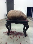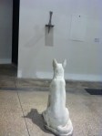 Jimmie Durham’s exhibition titled Streets of Rome and Other Stories uses materials like Romanesque furniture, smashed glass, bring symbols of nature, civility and human presence. I especially liked the cast dog sculpture sat patiently watching a silver cast bone hung high on it’s sculptural pedestal.