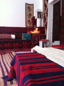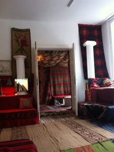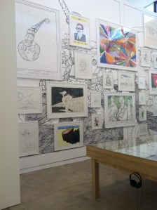Installation of Andreas Angelidakis Crash Pad, a hybrid space made from styrofoam and textiles, Tonel’s wall of illustrations titled Commerce.