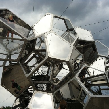 For a gorgeous hot summer afternoon, a must see is this season’s Met Roof Top installation is by Argentine architect Tomás Saraceno titled Cloud City.  The reflections of the glass surfaces mirror sky and tree tops as they intersect with windows and metal rivets creating a stunning illusion of land and sky hovering above you. On the clever marketing angle, the offer the Cloud City cocktail, a toxic blue drink that comes with a dry ice stirstick!