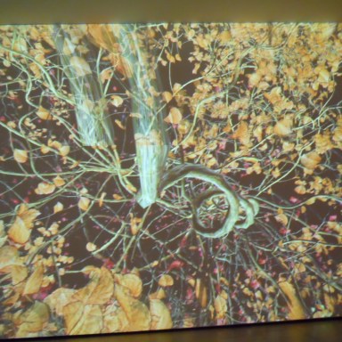 Jennifer Steinkamp recreates nature using 3-dimension animation in her wall projections. This projection was stunning and captivating. Staring up from under a massive tree, Steinkamp skillfully recreates the passage of time through the seasons. With blooming leaves and bursts of colourful flowers — then petals rain down on the viewer as summer moves to autumn, until there are only bare tangeled branches stretched out towards you. The seamless snaking arms of the tree loop back into each other and then […]