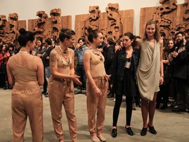 The NewArtNetwork and Volunteer Lawyers for the Arts hosted their winter social, a glam evening of performance, dance and music at the SculptureCenter. The incredible recovered wood sculptures by Ursula von Rydingsvard became the stage for a modern dance peformance choreographed by Nancy Garcia to present the F/W jewlery collection of SAMMA , by designer Hanna Sandin. As the dancers moved the jewlery clanged together and against the performers adding a weight to the sound of the performance.